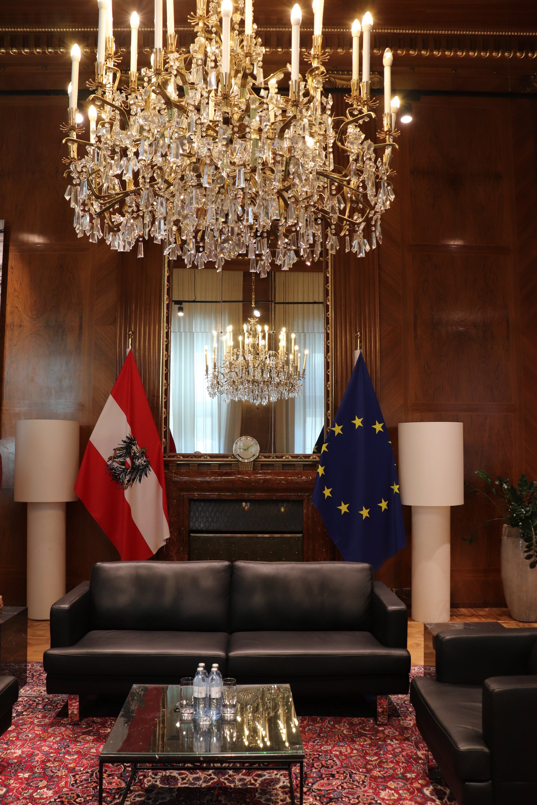Nach einer erfolgreichen Sicherheitsüberprüfung bekamen wir eine ausführliche Hausführung mit zahlreichen Fakten über die Geschichte Österreichs sowie über das Regierungsgebäude selbst. Besonders war hierbei die spontane Möglichkeit das Büro des Bundeskanzlers und seine Empfangsräume in Augenschein zu nehmen, welche sonst nur an besonderen Tagen von der Bevölkerung besichtigt werden können.