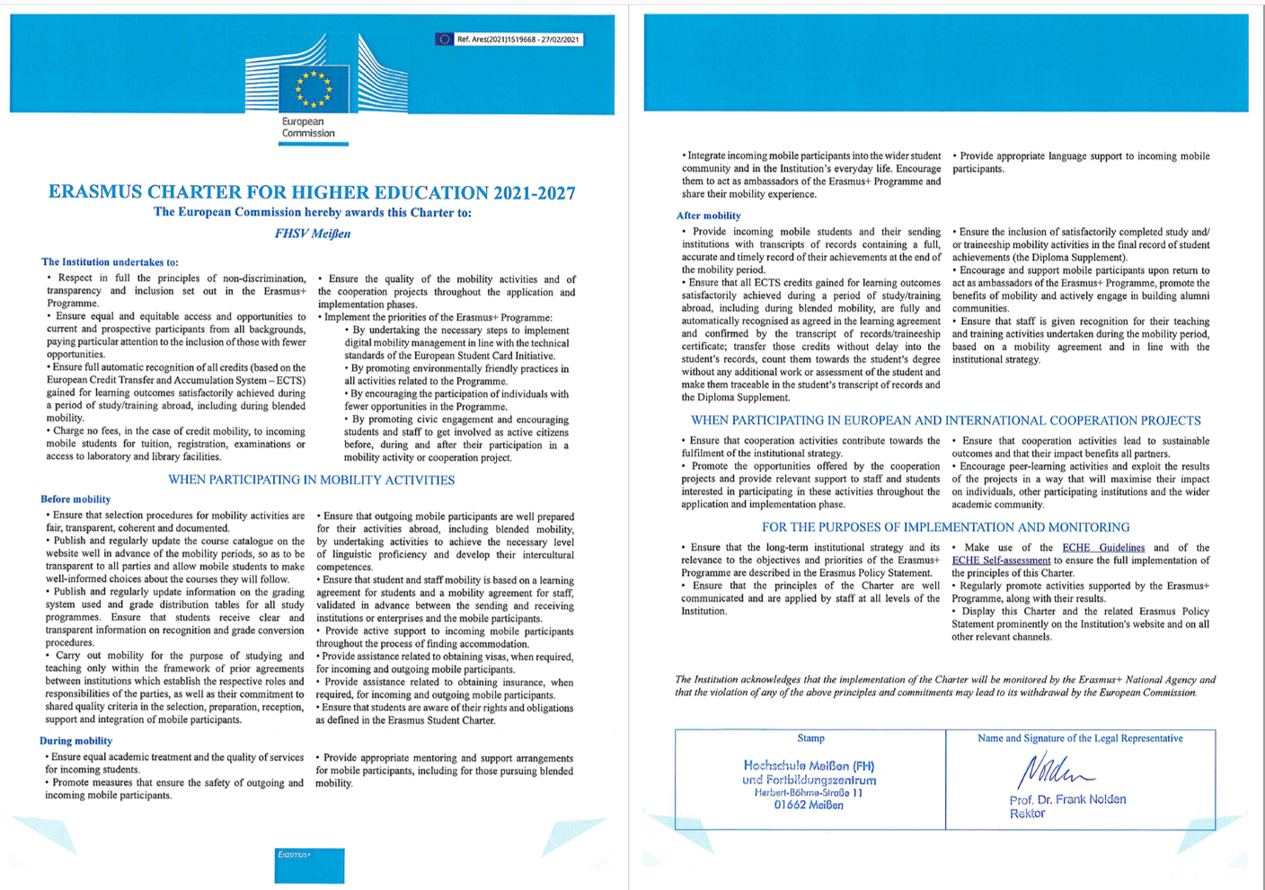 Die Erasmus-Charta für die Hochschulbildung (ECHE) ist die Grundvoraussetzung für Hochschulen, um am Programm Erasmus+ teilzunehmen, und legt den allgemeinen Qualitätsrahmen für Mobilität und Kooperation fest. Mit der Charta verpflichtet sich die HSF Meißen, die Qualitätsstandards des Programms zu erfüllen, ihre Internationalisierungsstrategie mit Erasmus+ zu verknüpfen und Grundsätze wie die Inklusion, die Anerkennung von Lernphasen und die Förderung der Chancengleichheit zu wahren. Erasmus-Charta (*.png, 0,93MB)